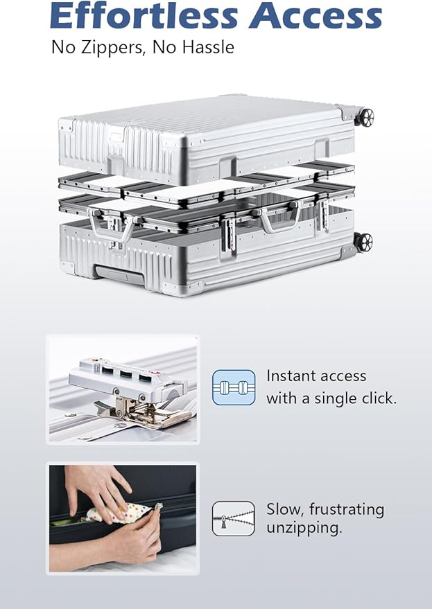 - ADVANCED ZIPPERLESS DESIGN: Our zipperless aluminum frame suitcase offers effortless access and enhanced protection. Secure latches replace traditional zippers, eliminating security concerns and stuck zippers. Perfect for travelers seeking peace of mind and convenience during their journeys.