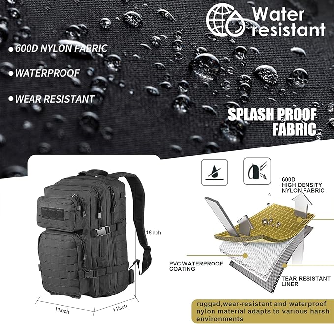 - Durable & Waterproof Material: Made from high-quality, water-resistant 900D nylon, this 40L tactical backpack is built to endure tough outdoor conditions. Ideal for hiking, camping, or tactical missions, it keeps your gear dry and secure in any weather.