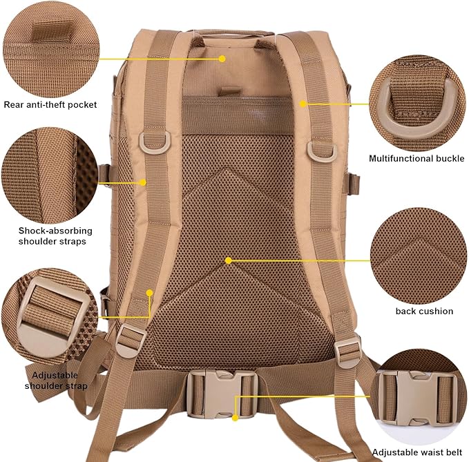 40L Tactical Backpack, Camouflage Military Bug Out Bag, Durable MOLLE Hiking Camping Gear (TAN)
