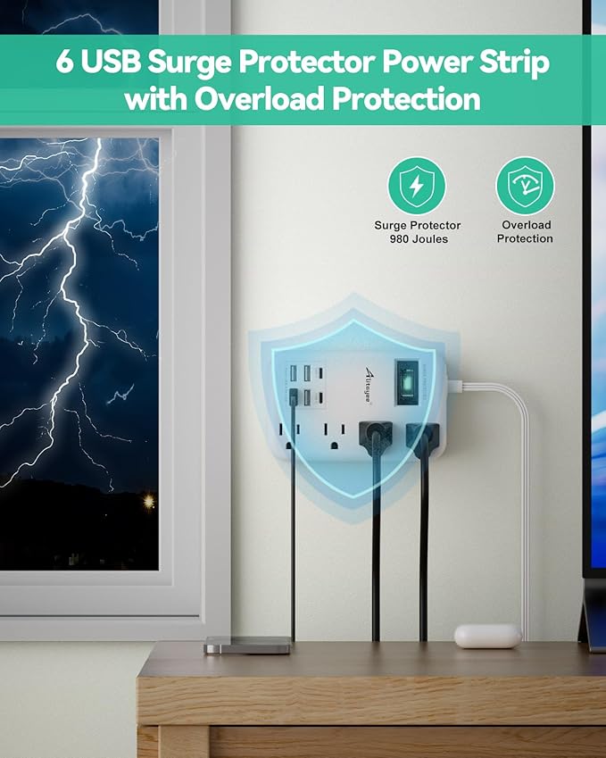 - 6 USB Surge Protector Power Strip with Overload Protection-The multiple safety protection USB power strip surge protector is certified by FCC, and made of Fire-resistant PC shell, with built-in multiple security module safeguards your electronic devices from surge,over-voltage,over-current and short circuit. 980J Surge protection rating to keep your electronics and mobile devices protected from voltage spikes.the reliable Lighted on/off switch with integrated circuit breaker will trip off automatically to protect your devices