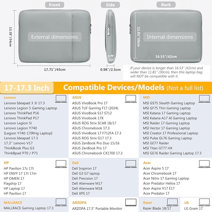 - Internal Dimensions: 16.53" x 11.81" x 0.79". Compatible with HP Laptop 17, HP Pavilion/ENVY/OMEN/Flagship 17, ASUS VivoBook (Pro) 17, ASUS ChromeBook 17.3, ASUS ZenBook Pro 17, ASUS ROG Strix Scar 17, ASUS TUF Gaming F17, Dell Inspiron/Precision/XPS 17, Lenovo Ideapad 3 3i 17.3, Lenovo ThinkPad P17, Lenovo Legion 17.3, Acer Chromebook/Nitro/Aspire 5 17, Acer Predator (Helios) 17, MSI Gaming Laptop 17, Razer Blade 17/18, MALLRACE Gaming Laptop 17.3, LG Gram 17, etc.