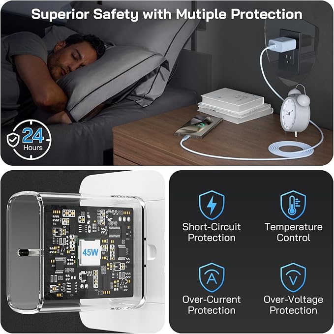 - 【What's Included】45W USB-C Charger Block x2, 10FT Type C to Type C Charger Cord for Samsung Phone x2, backed up by our worry-free 12-month warranty and 24/7 friendly customer support.