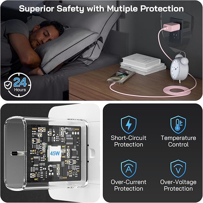 - 【What's Included】45W USB-C Charger Block x2, 6.6FT Type C to Type C Charger Cord for Samsung Phone x2, backed up by our worry-free 12-month warranty and 24/7 friendly customer support.