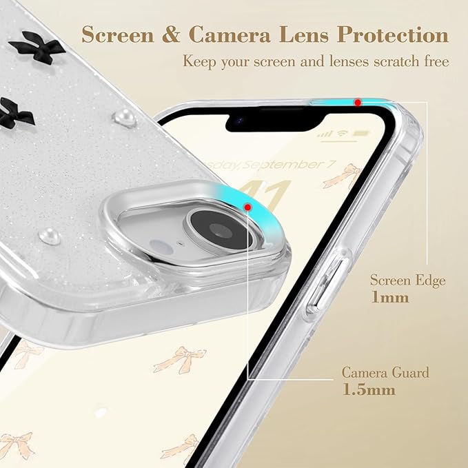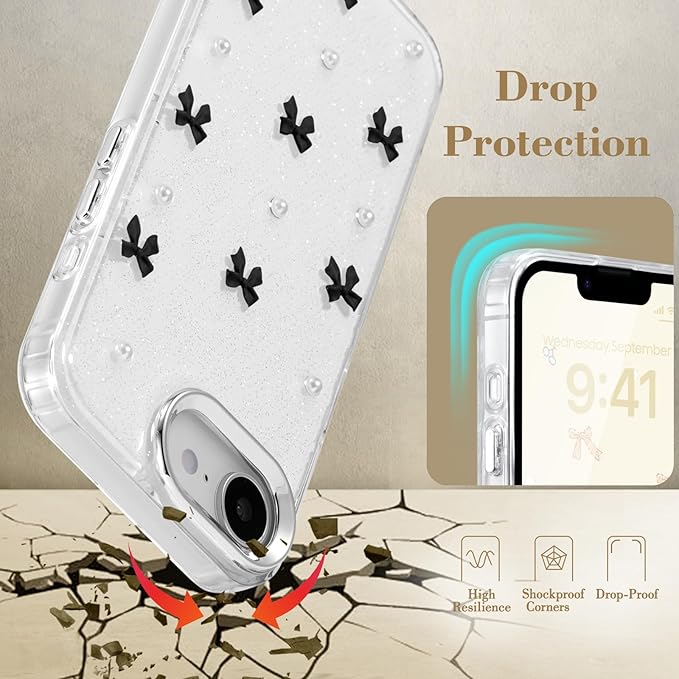 - Cute Fashionable Bow Design: Handmade 3D stereoscopic bow design, dotted with white pearls, the back of this case is sparkling transparent design, which not only shows the original appearance of the phone well, but also gives your phone a more stylish, lovely and exquisite kawaii appearance, adding unique charm to your phone. Using the glue drop sealing technology, the bows and pearls will not fall easily