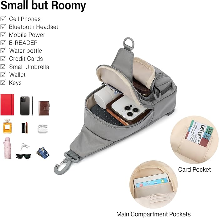 - 【Smart Organized Storage】This small sling bag for women features 5 strategically placed pockets: 1 quick-access open compartment (fits water bottles/compact umbrellas) + 4 secure zippered pockets including a hidden back pocket. And main compartment includes dedicated card slots and an open inner pocket.