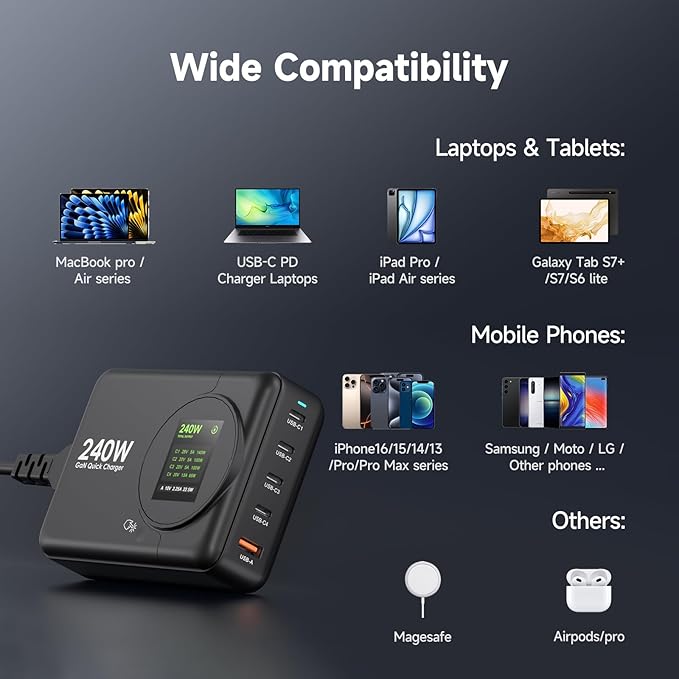 240W GaN Charger, 5-Port USB C Charger with 140W Max PD 3.1 Port, LED Display Desktop Charging Station Adapter for MacBook Pro/Air M3/M2/M1, Laptops, iPhone 15/14, Galaxy S24/S23, iPad, Steam Deck
