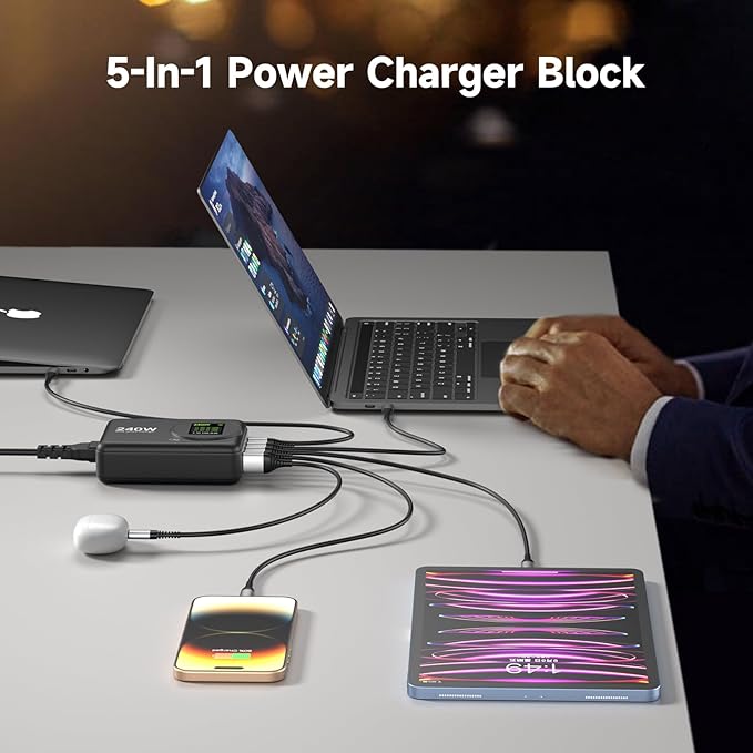 - 【5-in-1 Multi-Device Charging Hub:】Features 4 USB-C ports and 1 USB-A port to power up to four devices simultaneously. Intelligently distributes a total of up to 240W combined output, ideal for your laptop, tablet, phone, and earbuds (Max output requires specific port combinations, e.g., C1+C2 or C1+C3).