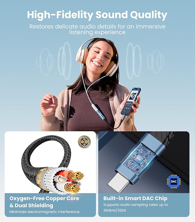 - Superior Sound Quality: This USB-C to 6.35mm headphone adapter features an integrated smart chip, supporting audio sampling rates up to 384kHz/32bit. The oxygen-free copper and dual shielding design reduce RF and EMI interference, ensuring pure sound quality. Gold-plated connectors enhance signal transfer, delivering high-fidelity audio ideal for musicians and audio professionals seeking top-quality sound from digital devices.