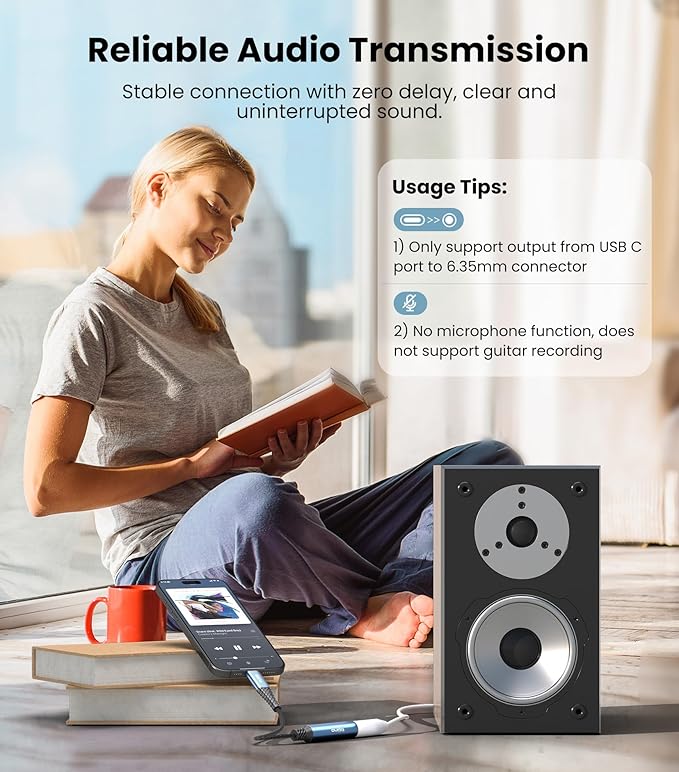 - The USB C to stereo audio adapter works with any device featuring a 6.35mm TRS jack. You can connect this USB C to 1/4 headphone adapter to other 1/4 aux audio adapters (such as 1/4 male to 3.5mm male audio cable, 1/4 male to 3.5mm female adapter, 1/4 TRS guitar cable), It’s compatible with iMac, MacBook, Galaxy S24/S23/S22, iPhone 15/16 series, and other USB C devices. Only transfer audio between devices, NO mic function, NOT support guitar recording.