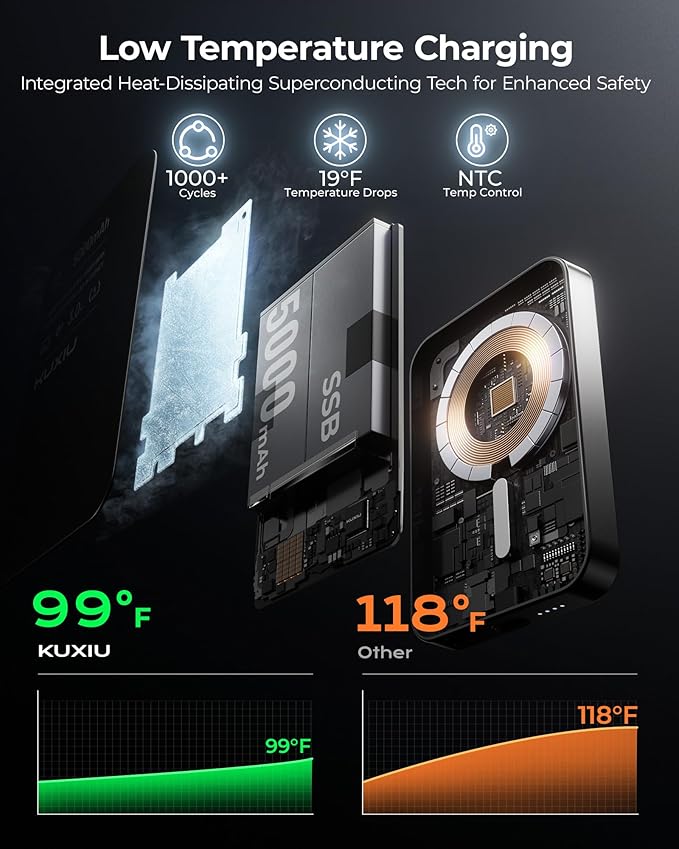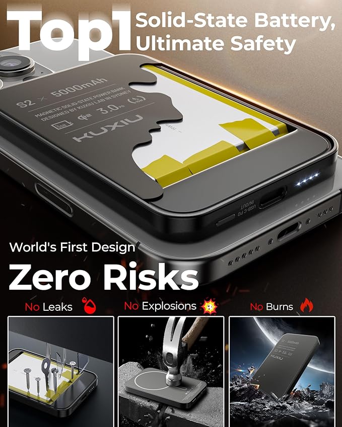 - World’s First Solid-State Power Bank for iPhone: KU XIU pioneers the introduction of globally leading solid-state battery technology into the power bank industry, providing the ultimate in safety. We conducted rigorous safety tests: repeatedly puncturing the battery cell with nails, with no smoke or fire throughout the entire test. Our power bank continued to charge the iphone stably, completely eliminating risks such as explosions or leakage. 200% safer than traditional lithium-ion power bank