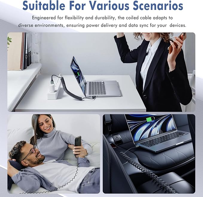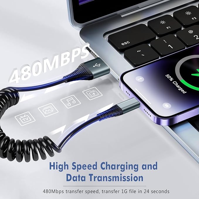 - 【Coiled Lightning Cable】A retractable iPhone car charger designed with high-elasticity TPU material and a spring structure (tested for 20,000+ stretch cycles).The short iPhone charger cord features a flexible coil that resists deformation, smoothly extends from 1ft to 3ft, and saves space while preventing tangles, with its Lightning connector remaining securely attached even on bumpy roads.
