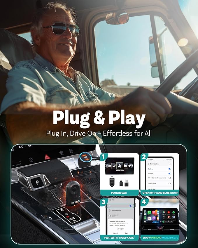 - SIMPLE ONE-TIME SYNC – READY IN MOMENTS: Upgrading to wireless is incredibly straightforward. The Ottocast Mini requires just a simple, one-time synchronization process. Plug it into your car's CarPlay/Android Auto USB port, pair it via Bluetooth on your phone using the intuitive on-screen guide (takes only about a minute!), and you're permanently set for automatic wireless connections on future drives. No complex configurations, no special knowledge needed – just plug, sync once, and enjoy!