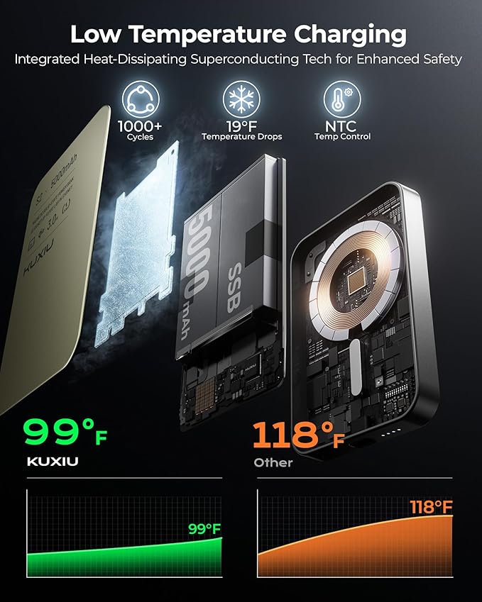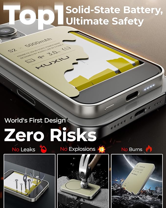 - World’s First Solid-State Power Bank for iPhone: KU XIU pioneers the introduction of globally leading solid-state battery technology into the power bank industry, providing the ultimate in safety. We conducted rigorous safety tests: repeatedly puncturing the battery cell with nails, with no smoke or fire throughout the entire test. Our power bank continued to charge the iphone stably, completely eliminating risks such as explosions or leakage. 200% safer than traditional lithium-ion power bank