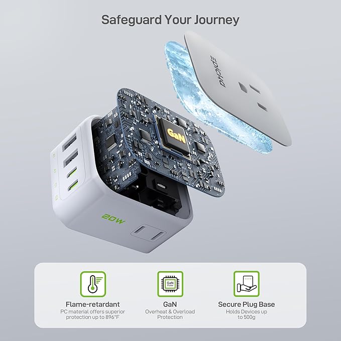 - 8-in-1 European Travel Plug Adapter: This European travel adapter features 8 outlets-4 AC sockets and 4 USB fast-charging Ports (including 2 USB-C). It offers more ports in a smaller size, measuring just 2.83 × 2.17 × 1.38 inches. The foldable prongs make it easy to pack and perfect for travel, while the thoughtfully designed outlet layout ensures the front-facing AC sockets never block the USB ports—maximizing charging efficiency in tight spaces.