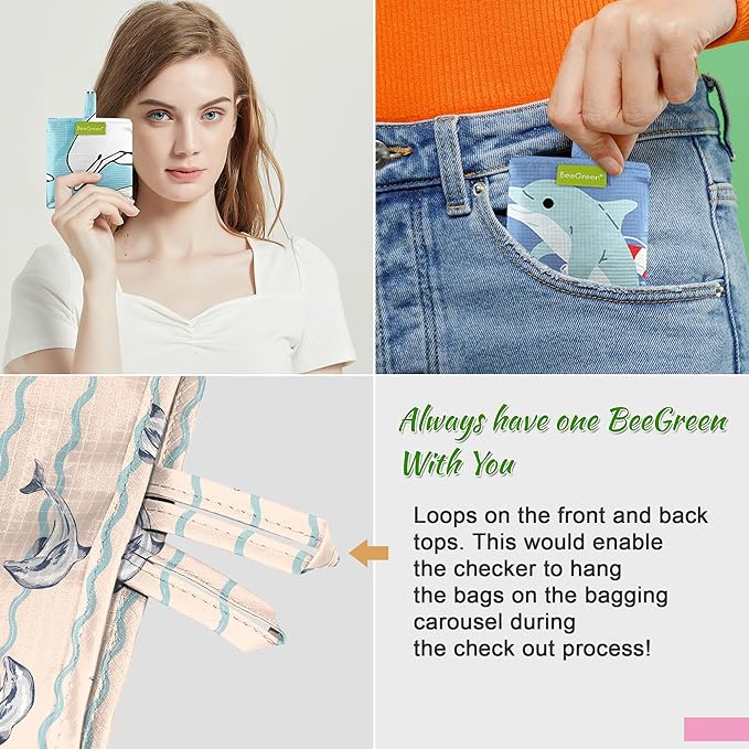 BeeGreen Dolphin Reusable Shopping Bags 6 Pack - Heavy Duty Washable and Foldable Polyester Shopping Bag for Women, Reusable Gift Grocery Totes Market Tote Bag with Handles for Travel Holiday