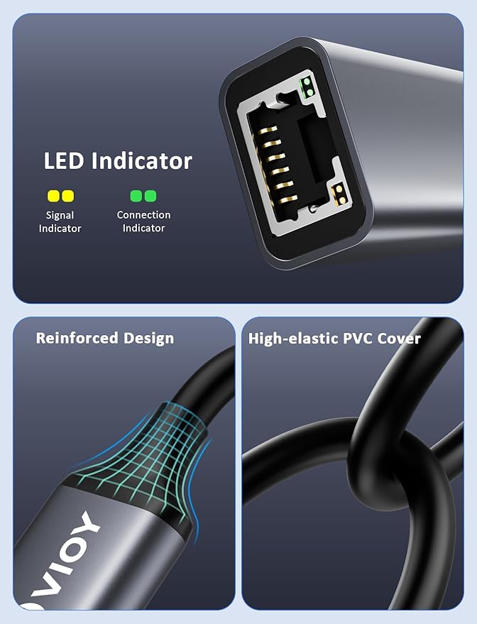 - Stable & High-Speed Connection: VIOY USB-C to RJ45 Ethernet adapter delivers ultra-fast speeds up to 1000Mbps, with backward compatibility for 100Mbps/10Mbps networks. Ideal for lag-free online work, video meetings, gaming, 4K streaming, and large file transfers. Note: For optimal 1Gbps performance, use a CAT6 or higher Ethernet cable