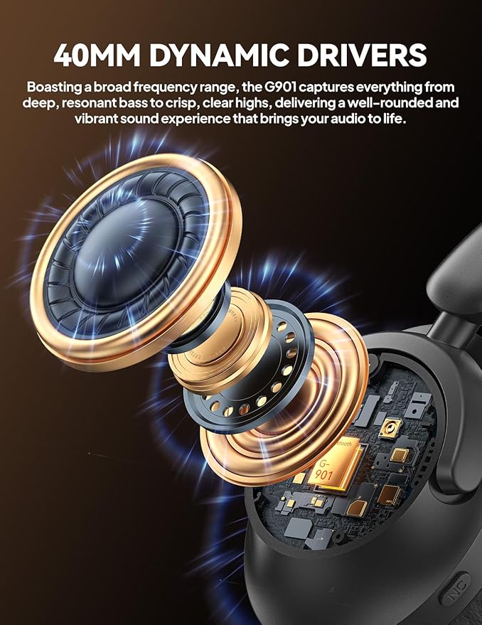 - Music Enjoy with Deep Bass: Equipped with custom 40mm dynamic drivers, G901 over-ear headphones deliver High-quality audio with balanced deep bass and crisp highs. Whether wireless or wired (via 3.5mm AUX), enjoy studio-quality sound with enhanced clarity and detail, perfect for music, movies, and gaming