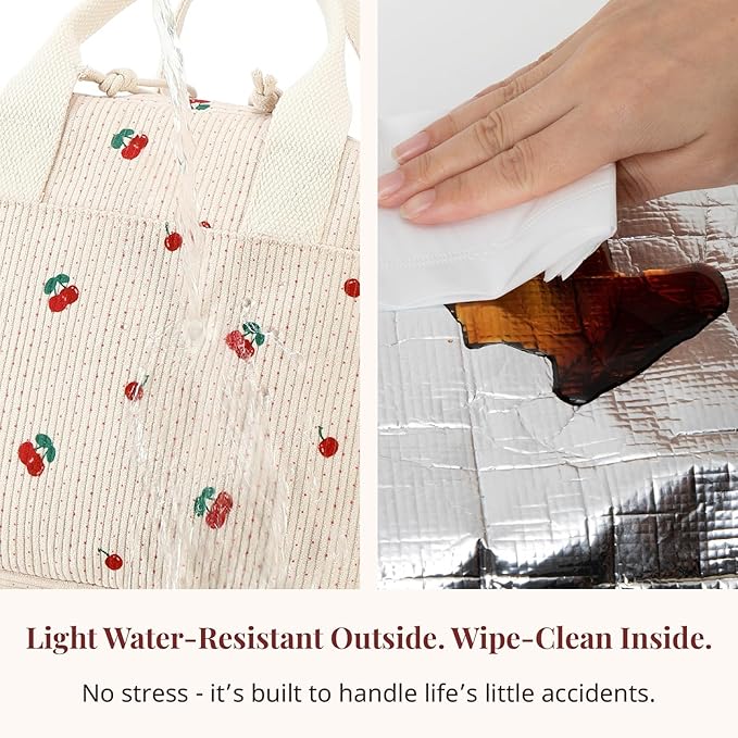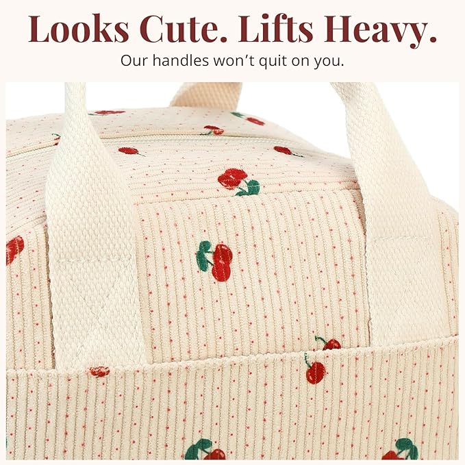 Insulated Cherry Lunch Bag for Women, Stylish Corduroy Tote with Aluminum Lining, Large Capacity Reusable Cooler for Work, Travel, Beach or Picnic, Beige Cream Water-Resistant Lunch Box