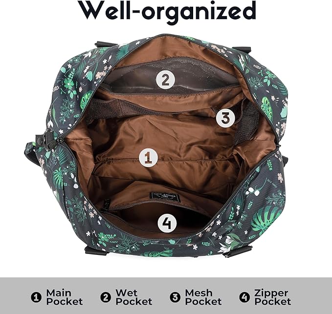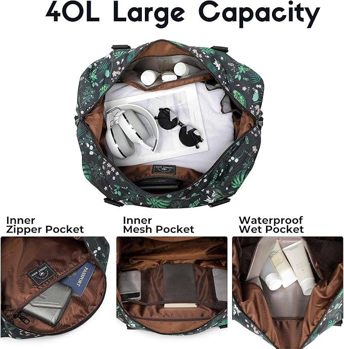 SUNNY BIRD Duffel with Utility Pouch, 40L Weekender Overnight Bag with Shoe Compartment for Travel and Sports (Floral & Foliage)