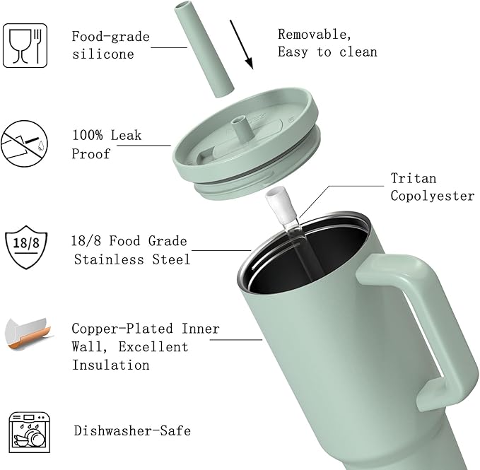 TILUCK 40 oz Tumbler with Handle, Vacuum Insulated Stainless Steel Travel Mug with 100% Leak-Proof Silicone Straw Lid, Cupholder Friendly Water Bottle(MintGreen, 40oz)