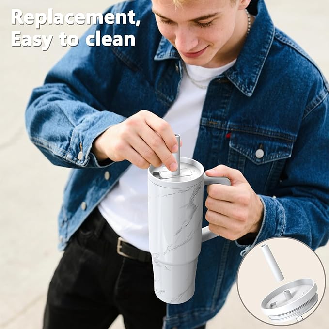TILUCK 30 oz Tumbler with Handle, Vacuum Insulated Stainless Steel Travel Mug with 100% Leak-Proof Silicone Straw Lid, Cupholder Friendly Water Bottle(Marble, 30oz)