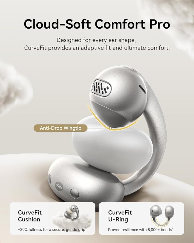 - All-Day Clip-On Comfort: The open-ring clip earbuds feature ultra-soft, resilient CurveFit cushions, anti-drop wingtips, and a flexible TPU U-ring with memory titanium wire tested for 8,000+ bends. At just 5g, these open-ear earbuds are designed to offer a breathable, adaptive, secure fit with cloud-like comfort for various ear shapes without irritation and pressure