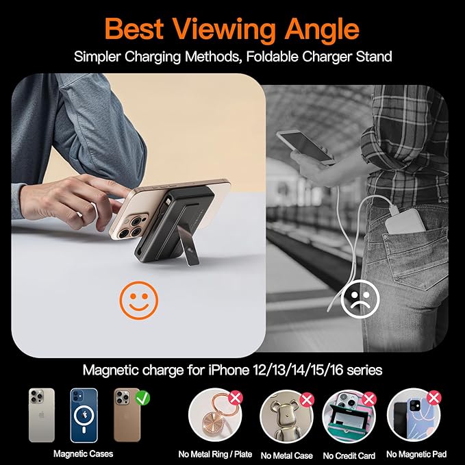 - Strong magnetic attraction:Equipped with a built-in powerful N52 magnetic coil, designed specifically for Magsafe battery packs, perfectly aligned with the Magsafe iPhone 17/16/15/14/13/12 series. Even during outdoor activities, it will firmly adhere to the phone without slipping off, ensuring your safety. When charging, simply lightly align the phone magnetic coil with the battery pack for wireless charging
