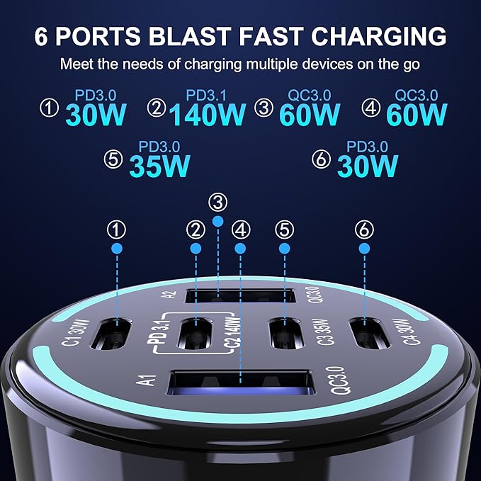 - Super Fast 140W PD3.1 Charging: Advanced PD3.1 technology delivers 140W ultra-rapid charging through USB-C2 port (0-80% in 30 mins for 16" MacBook Pro), 3X faster than old car chargers
