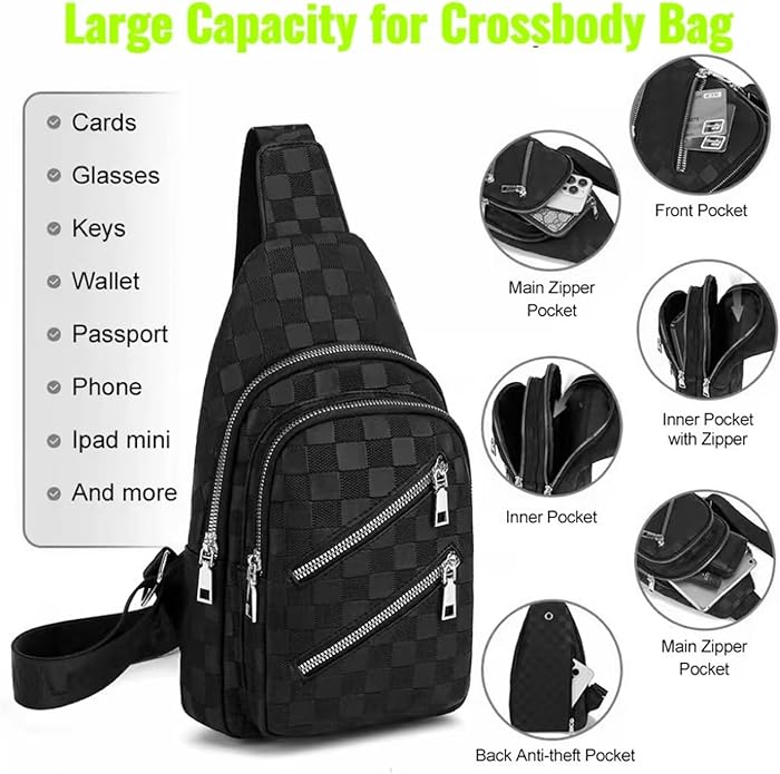 Checkered Black Leather Crossbody Bag for Women - Water Resistant Sling Bag, Adjustable Strap Chest Pack Fanny Pack