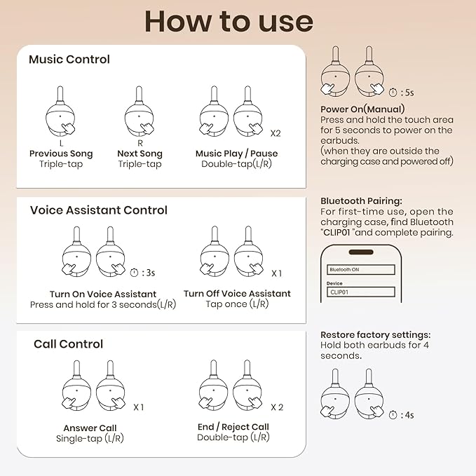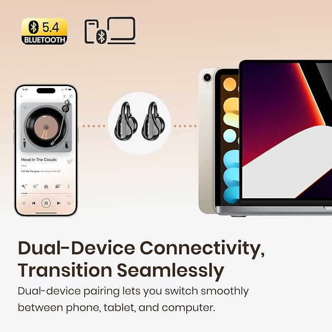 - Ultra-low latency & Clear Call: Step up your connectivity with the latest Bluetooth 5.4 technology. Our wireless earbuds offer an exceptional, stable connection and synchronized audio-video playback.When opening the charging case, these Clip-Ear headphones will turn on and connect to the previously connected device instantaneously, taking both headset out for pairing automatically.