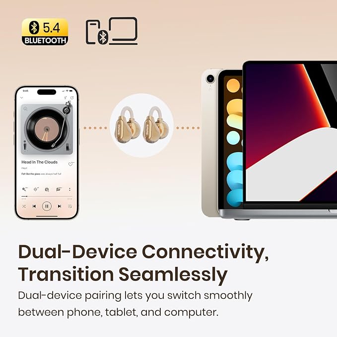 - Ultra-low latency & Clear Call: Step up your connectivity with the latest Bluetooth 5.4 technology. Our wireless earbuds offer an exceptional, stable connection and synchronized audio-video playback.When opening the charging case, these Clip-Ear headphones will turn on and connect to the previously connected device instantaneously, taking both headset out for pairing automatically.
