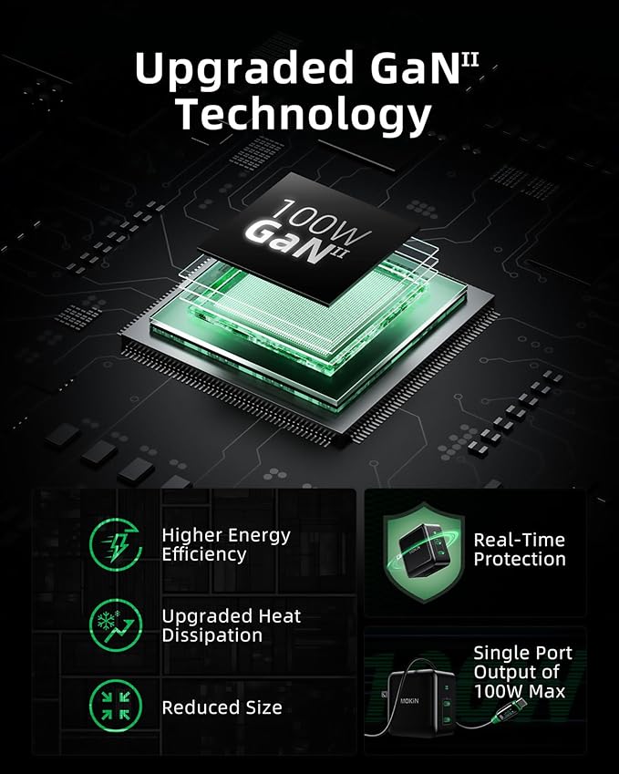 - 【Powered by GaN+ Technology】:GaN+ technology enhances charger performance, achieving superior power density and efficiency compared to traditional silicon-based models. Yields compact, lightweight designs with minimized energy loss, optimized energy utilization, and decreased heat generation