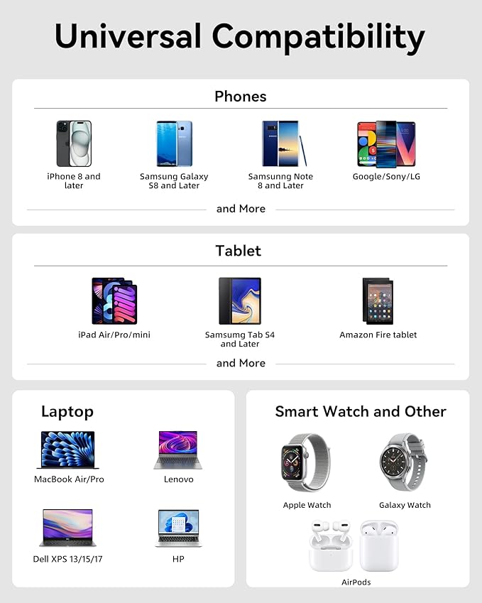 - 【Universal Compatibility】:iPhone 16/15/14/13/12/Pro/Pro Max/Plus/mini, iPad Air/Pro/mini, MacBook Air/Pro, Galaxy S25/S24/S23/S22/S21/S20, Note, Pixe, Apple Watch, XPS 13, Latitude, Inspiron 14/16, Precision 3480/3580, Envy, Chromebook x360, Spectre x360/Foldable, Chromebook 3110, EliteBook, ProBook, ZBook, etc