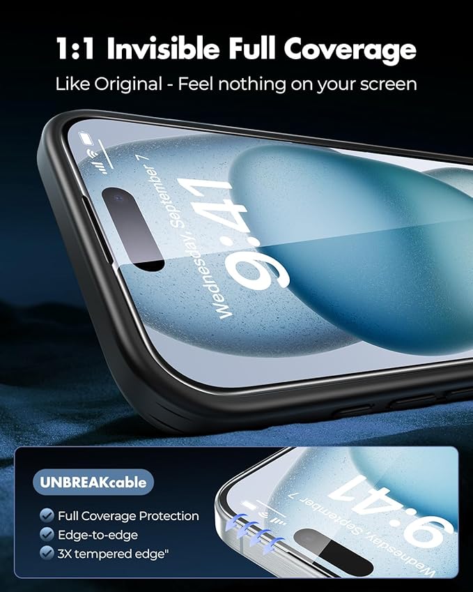 - 【Invisible 1:1 Full-Coverage Protection】The UNBREAKcable screen protector perfectly mirrors the iPhone’s screen design, featuring a reinforced 1:1 3D curved black edge that fully covers and protects the most vulnerable parts of your screen. Seamlessly blending with the iPhone 15, it offers robust protection while remaining visually invisible.
