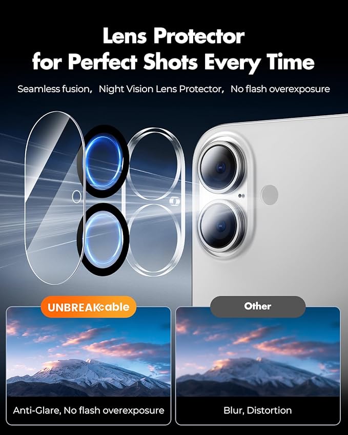 UNBREAKcable 2+2 Pack for iPhone 16 Screen Protector & Lens Protector 【Military-Grade】【Easy Install】【Efficient Night Shot】9H+ Shatterproof Tempered Glass Film,Bubble-Free&Anti-Fingerprint ,Case Friendly-6.1 inch
