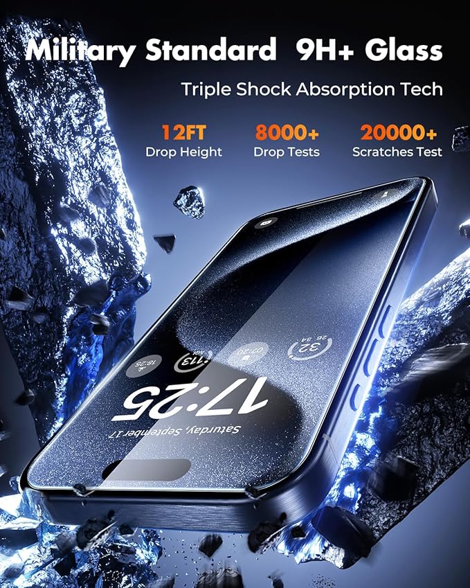 - Military-grade durability, tough as nails: Made with 9H+ glass, this iPhone 15 Pro protector passed 220lb pressure and 12ft drop tests. Reinforced edges guard against cracks and chips from daily impact and scratches.