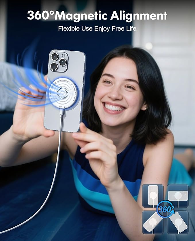 - 360° Strong Magnetic Alignment : This charger snaps to your iPhone like it’s part of the device. supports 360° charging in any direction. Tested to hold firm through Airplane Turbulence and Car Vibrations –Note: Non-Mag-Safe cases may weaken magnetic adsorption. For stronger attachment, we recommend using a Mag-Safe-compatible case. LED Charge Indicator glows blue during charging (automatically turns off after 1 minute), perfect for Nightstand Use