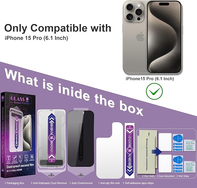 - Auto Dust Removal & Easy Alignment: This iPhone 15 Pro screen protector is designed with advanced auto dust removal and self-aligning technology to ensure a flawless,bubble-free installation every time. Simply place the alignment frame on your phone,pull the tab gently,then press and slide to push out any remaining air. The process is quick and hassle-free. For the best results,we recommend watching our step-by-step installation video before getting started