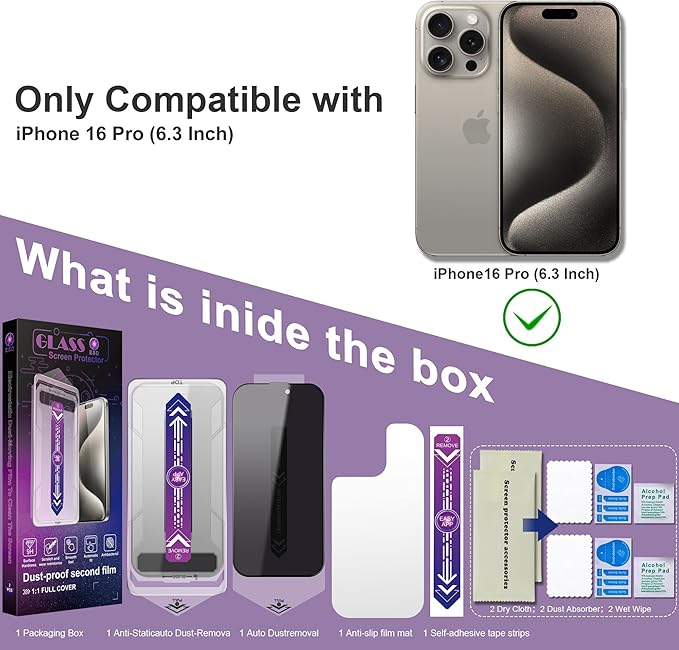 - Auto Dust Removal & Easy Alignment: This iPhone 16 Pro Max screen protector is designed with advanced auto dust removal and self-aligning technology to ensure a flawless,bubble-free installation every time. Simply place the alignment frame on your phone,pull the tab gently,then press and slide to push out any remaining air. The process is quick and hassle-free. For the best results,we recommend watching our step-by-step installation video before getting started