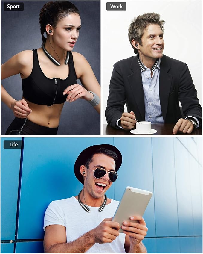 - 【Hands-Free Calls & IPX5 Waterproof】The neckband Bluetooth headphones feature an advanced noise-canceling microphone that delivers clear, high-quality calls, even in noisy environments. The intelligent vibration alert pulses gently against your collarbone during calls, ensuring you never miss important communications even in silent mode. Additionally, this wireless speaker is both waterproof and rainproof, capable of enduring water splashes and drips. It's perfect for outdoor activities such as biking, hiking, and camping.
