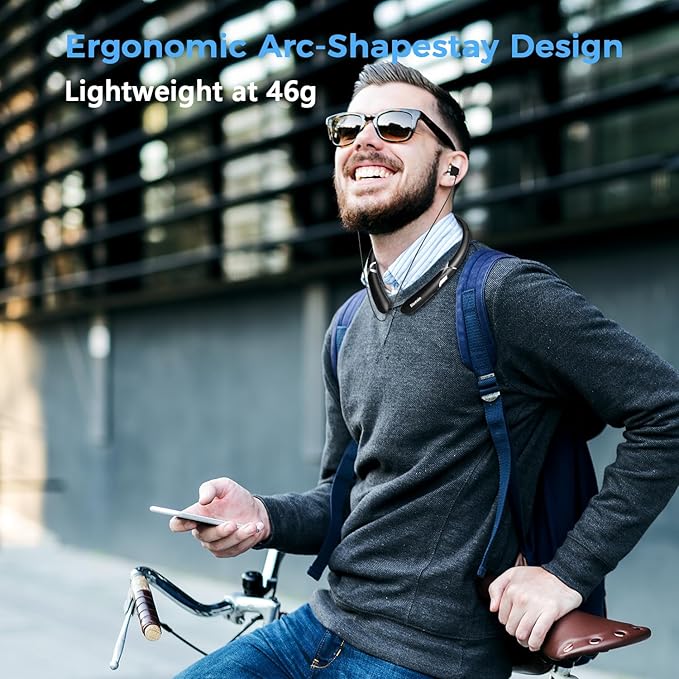 - 【Ergonomic Shape-Stay Design & Lightest Weight at 48g】The soft TPU rubber shape-stay neckband features skin-friendly material that naturally conforms to neck contours. Based on ergonomic Shape-Stay design, once you put this wearable headphones around your neck, you’ll hardly know you’re wearing it, weighing only 48g, and you’ll never feel a burden by leaning lightly on the shoulder. Stay comfortable for listening all day.