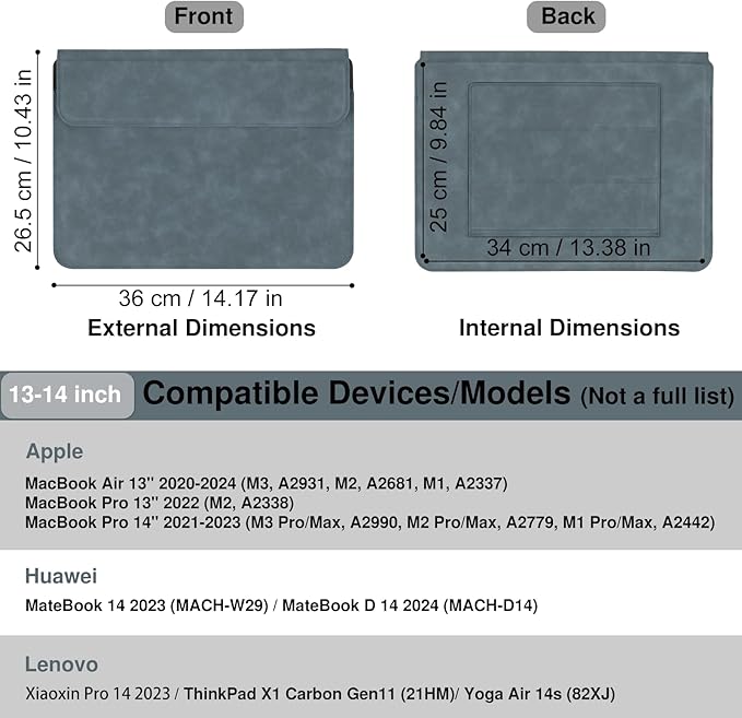 - Dimension: External dimensions: 14.17 x 10.43 inches. Internal dimensions: 13.38 x 9.84 inches. Compatible Models: MacBook Pro 14" 2021-2024 (M1 M2 M3 M4 Pro/Max A2442, A2779, M3 A2918, A2992, M4 A3112, A3401, M4 Max A3185)/MacBook Air 13" 2010-2017 (A1466 A1369)/MacBook Pro 13" 2010-2015 (A1502 A1425 A1278). Also compatible with other brands of laptops