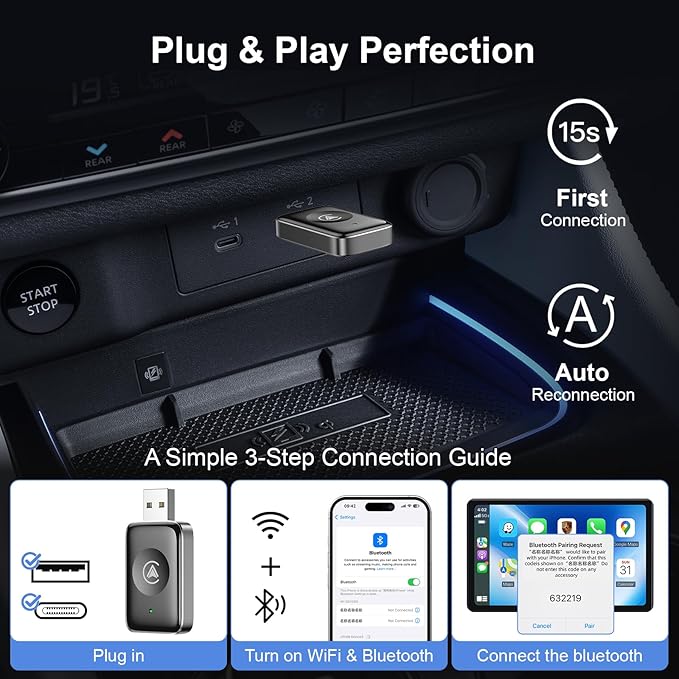 - 【Plug-and-Play, No Setup Required】Optimized for driving scenarios, it automatically reconnects upon entering the vehicle after initial pairing. 50% smaller in size but as powerful as a semi-truck—effortlessly fits into tight parking spaces. Equipped with a USB-A + Type-C cable for plug-and-play magic. Ready to use out of the box, no updates required. Focus on the road, not the loading progress bar. This compact device handles all the heavy lifting