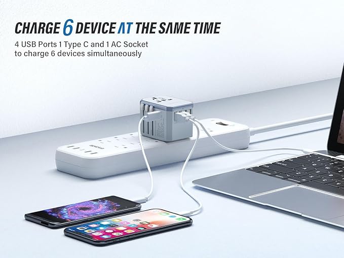 - 6 IN 1 TRAVEL ADAPTER - Charge up to 6 devices simultaneously at high speed with 4 USB-A ports (2.4A), 1 USB-C port (3A), and 1 AC socket. Ideal for charging iPhones, laptops, tablets, power banks, cameras, headsets, and more.