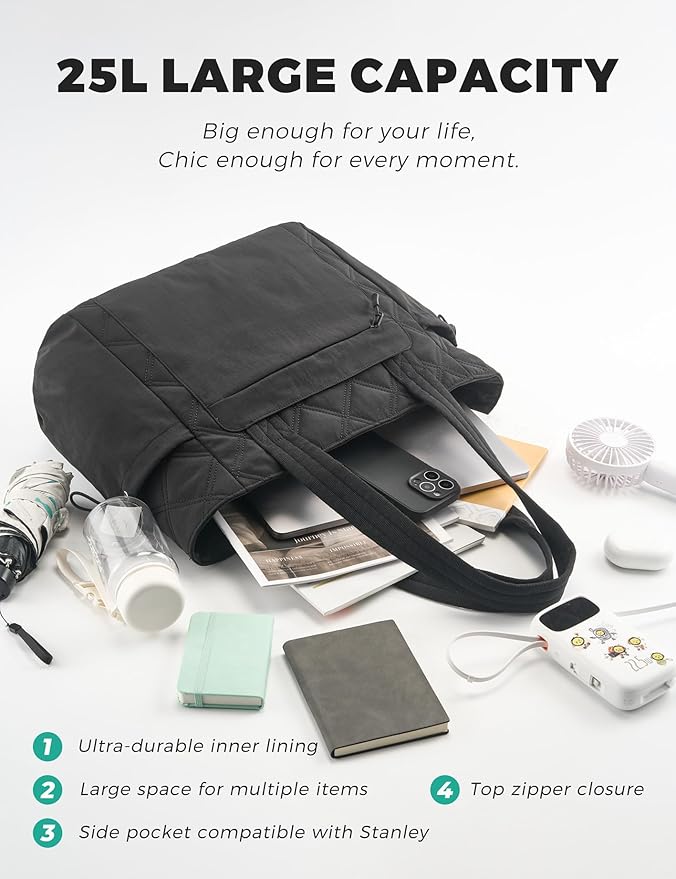- 【Premium Quilted Tote Bag for Women】: Elevate your everyday carry with this ultra‑light 1.3lbs puffer tote bag—designed as the perfect tote bag for women who demand both style and substance. Featuring a diamond‑quilted, dual‑stitch embroidery in contrasting colors, it seamlessly pairs fashion‑forward flair with the versatility of a puffer tote bag.It is also a good travel tote bag and work tote bag.