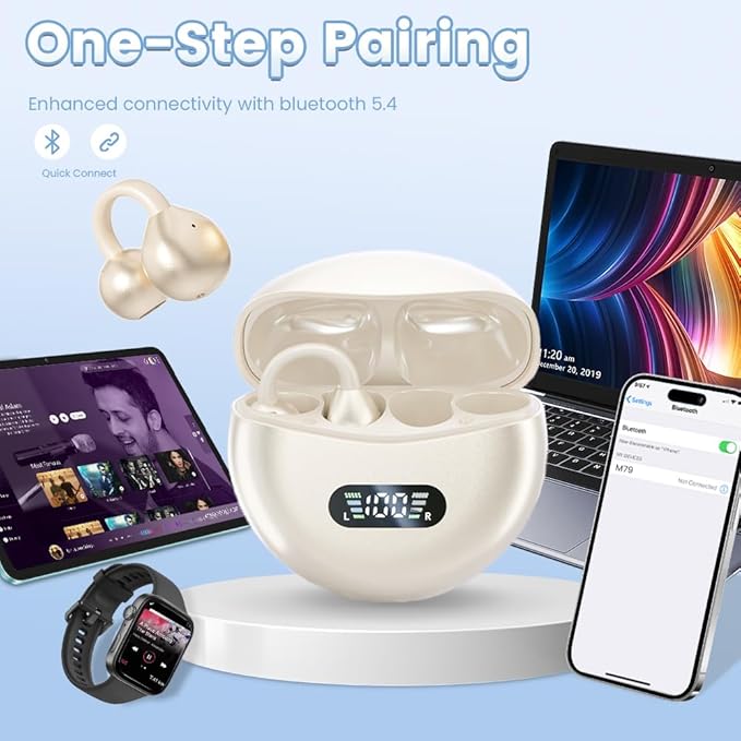 - ππππ©ππ‘πππ πππ¨ππ§π’π’π§π π±.π― ππ’π‘π‘πππ§ππ©ππ§π¬ β With advanced Bluetooth 5.3, these open ear headphones wireless Bluetooth deliver faster connections, lower latency, and more stable performance. The smart auto-pairing feature activates instantly when you take the clip on ear buds out of the case, ensuring a seamless and reliable experience.