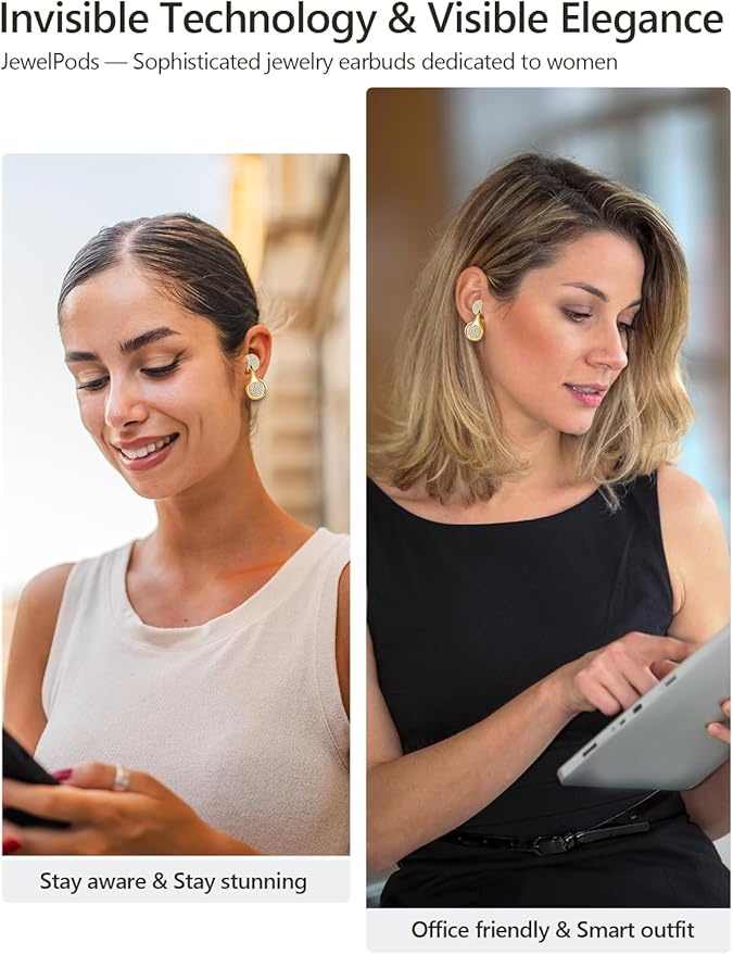 - Jewelry Elements: Jewelpods H01 is made from rare metals with 14K real gold plated , and features over 200 prong setting AAAAA zirconia stones.It sparkles and shines, complementing your jewelry and adding a touch of luxury, making it a standout piece on its own.Breaking away from the traditional plastic feel of earbuds.