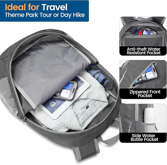 - Reasonable and Orderly: Our ultralight packable backpack capacity is 25L,and the pocket structure layout is reasonable and orderly.One main bag can accommodate sandwich lunch boxes and inner partitions to accommodate A4 paper size files;One inner bag can store important small items such as passports;2 front bags can store small booklets such as travel guidelines;2 side bags can store water bottles and umbrellas