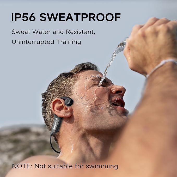 - [IP56 Sweatproof for Any Weather] Bone conduction headphones bluetooth, with an IP56 waterproof rating, are designed to resist water and sweat, keeping you ready for workouts and adventures. Don’t let the weather hold you back. (Not suitable for underwater swimming use)