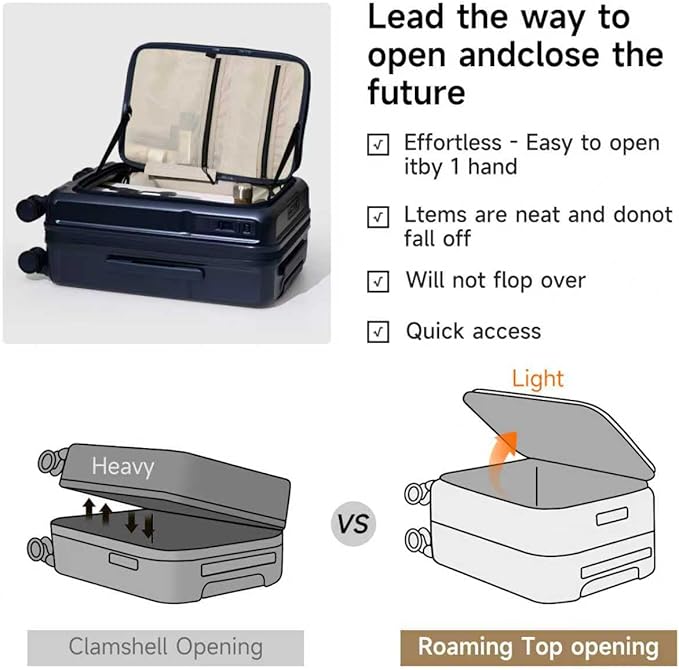 - 【Dual Opening Design】: Featuring an innovative dual-opening mechanism that allows for effortless opening or closing of the suitcase. The half-opening design accommodates a 15.6-inch laptop and other small items, enhancing both loading convenience and space efficiency. This design addresses the challenge of traditional two-compartment luggage being difficult to open or close under heavy load while preventing item displacement.